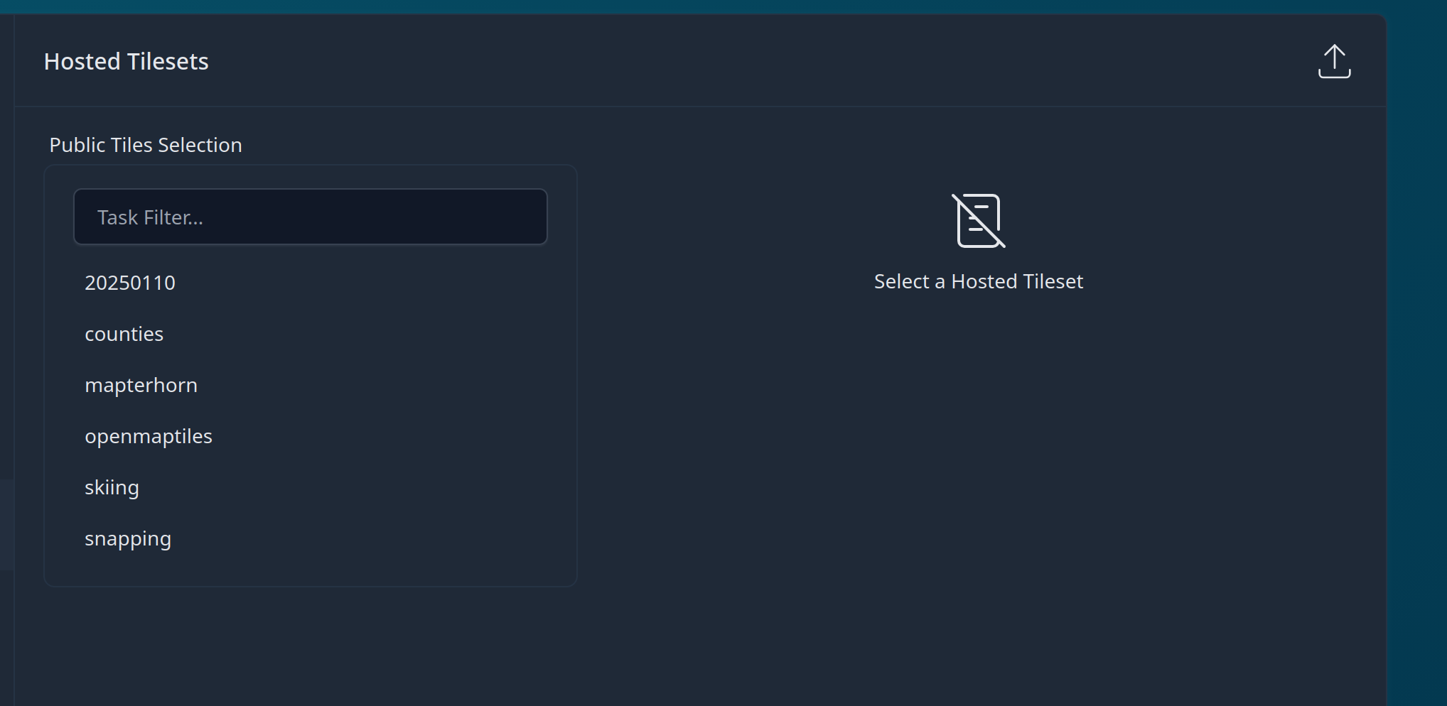 To upload a new TileSet to the server, Click on the upload button in the upper-right-hand corner.