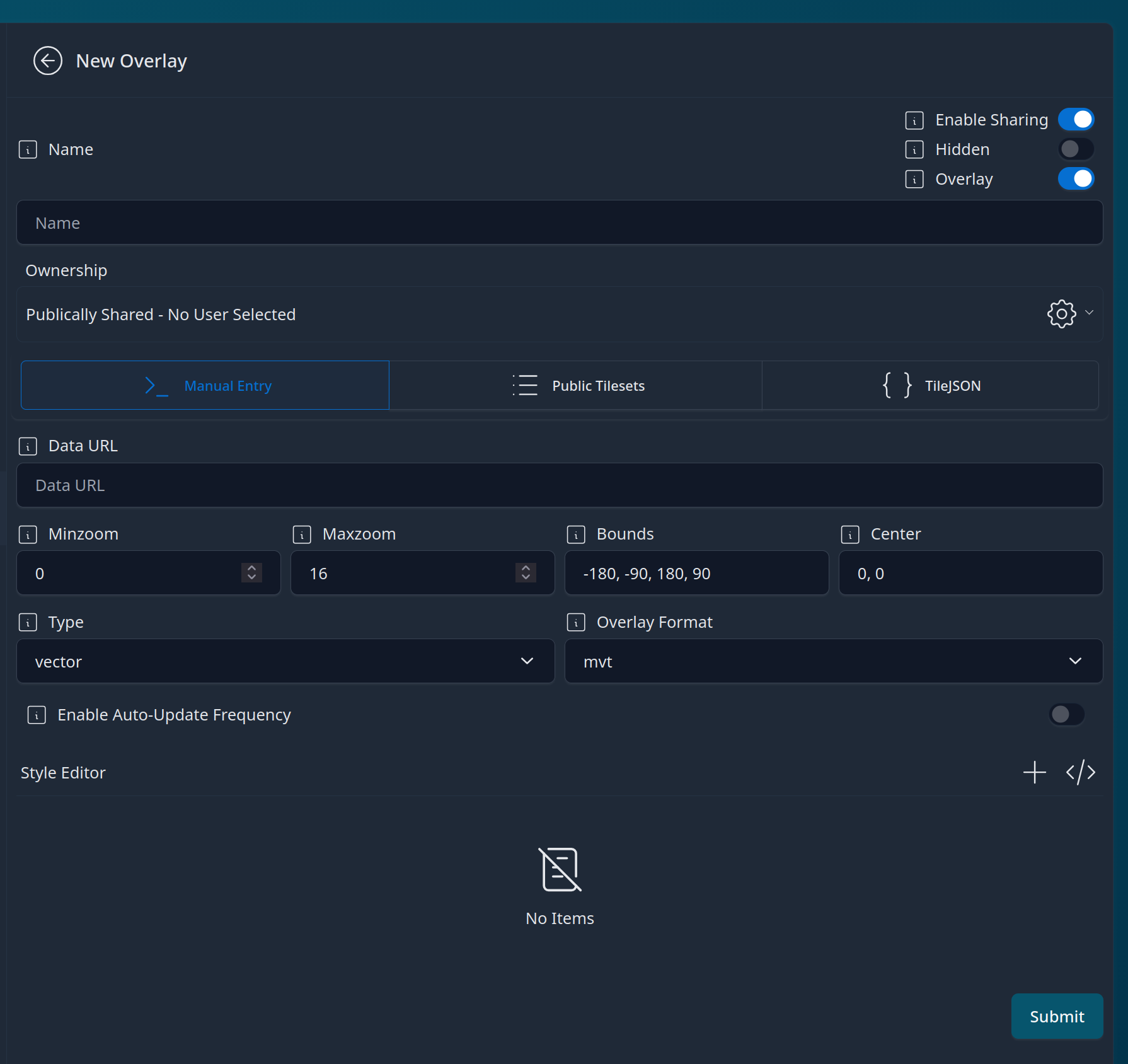 Choose the source of the Tiles, Manual Entry supports quadkey, zxy, and ESRI Servers. Some example URLs can be seen below.