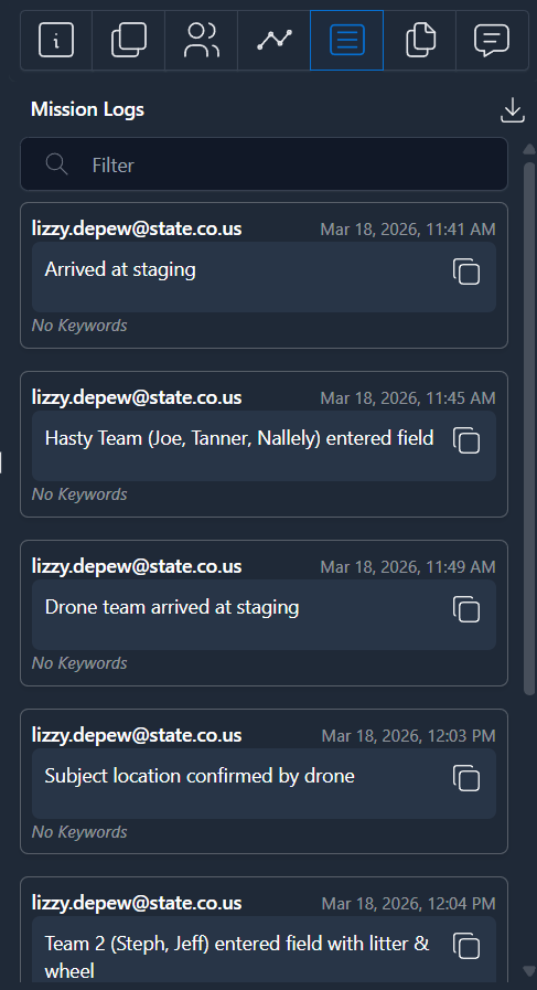 Logs: Allows for documentation of mission. Logs can be downloaded as a .csv by clicking "Save Log."