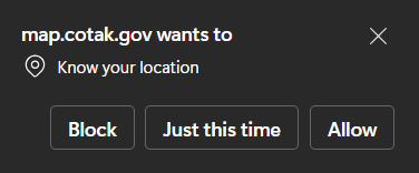 You will be prompted: map.cotak.gov wants to Know your Location. Select “Allow".