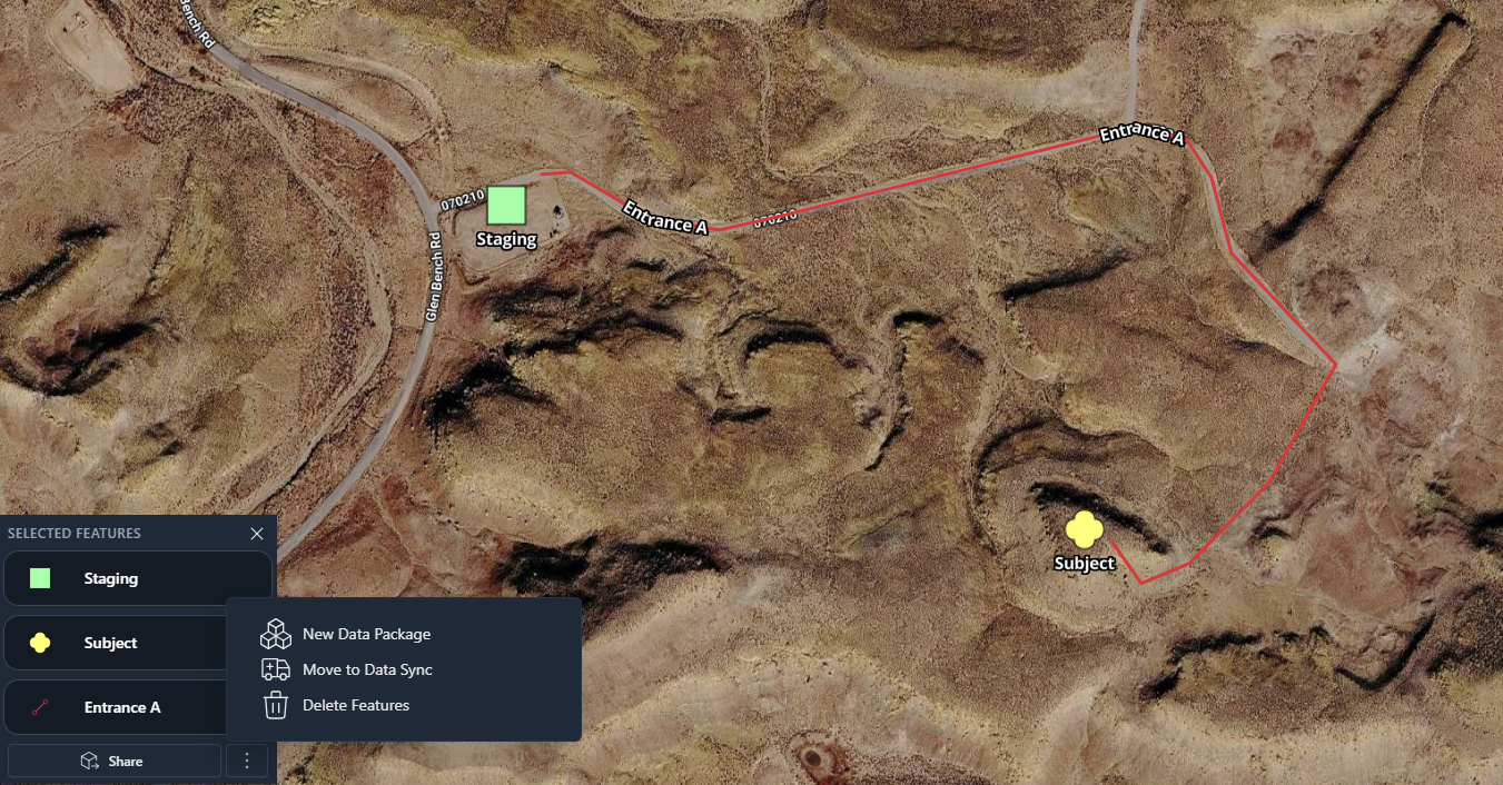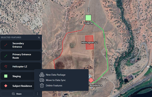 Lasso Select: Creates a lasso to select any features on your map. Single click to start, single click to finish. After features have been selected, they can be shared, deleted, added to a Data Package, or added to a Data Sync.