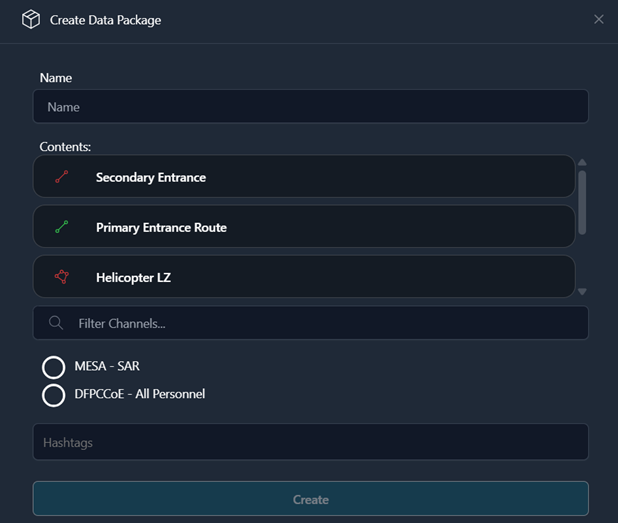 A tool to bundle items you might want to share with other TAK users. To create a new Data Package use the Lasso Tool (see Drawing Tools) to select existing features on your map. After lassoing your features, a menu will appear displaying captured features.