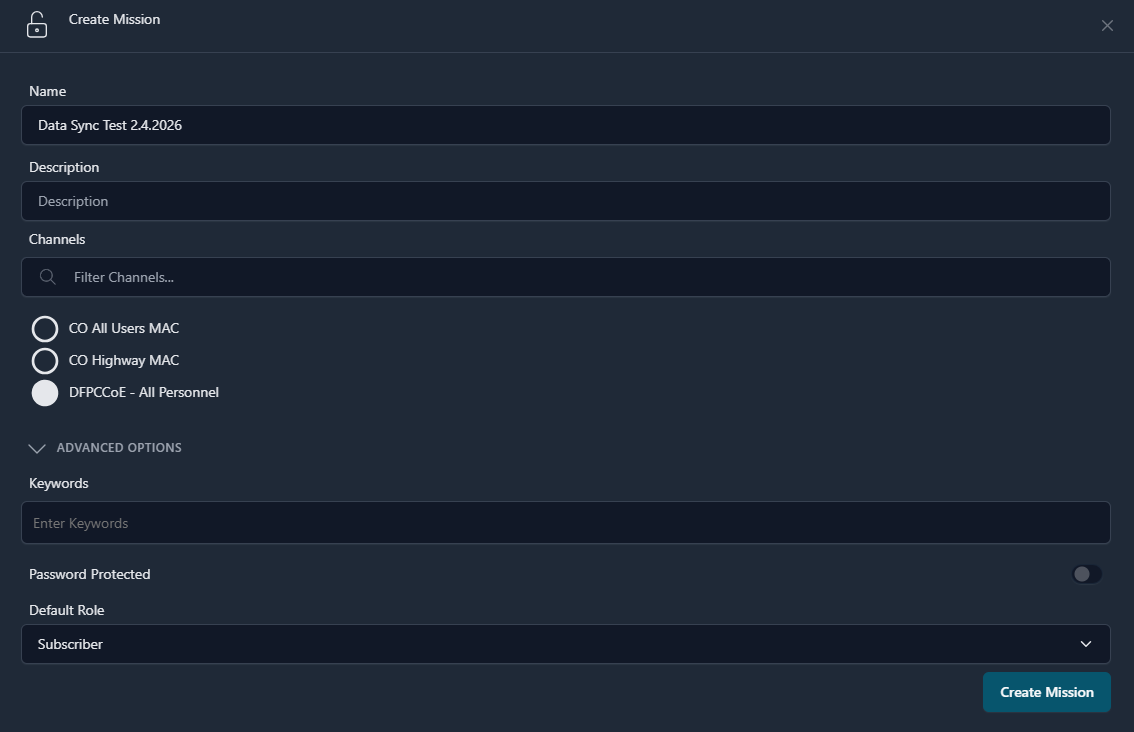 (Note: Only channels you currently have turned on will be displayed as options). Advanced Options allows you to password protect your Data Sync and control whether users are Owners (Able to subscribe to, edit, and delete the Data Sync), Subscribers (default, able to subscribe to and edit the Data Sync) or Viewers (able to subscribe to the Data Sync but not able to make any edits).